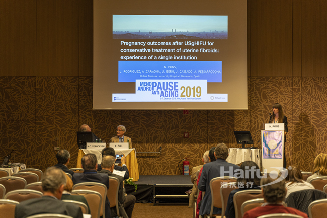 来自西班牙HMT医院 HIFU中心的Pons医生分享了HIFU治疗后,患者自然怀孕的回顾性研究结果以及长达8年的术后随访结果,展示了重庆海扶医疗的海扶刀治疗的长期疗效(肌瘤生长的有效控制、症状的持续缓解)。在问答环节,医生听众对重庆海扶医疗的设备及技术非常感兴趣,提问积极踊跃。