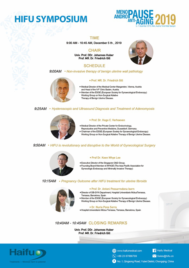 2019年Menopause Andropause Anti-Aging展会于2019年12月5日-7日在奥地利维也纳举行,该会议是具有30年历史的欧洲德语区顶级妇科医生的顶级品牌会议,约500人参会。海扶医疗参展此次会议并在会议首日开幕仪式后举办了90分钟的海扶®研讨会。