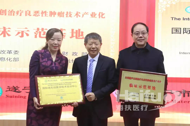 2019年12月15日,遂宁市中医院·遂宁市妇幼保健院“全球超声无创治疗良恶性肿瘤技术产业化临床示范基地”与“国际微无创医学技术培训中心”授牌仪式在医院举行。授牌仪式上,海扶刀®聚焦超声肿瘤治疗系统第一发明人超声医疗国家工程研究中心主任王智彪教授向医院授牌,医院党委书记何元军、院长何佳分别接牌。