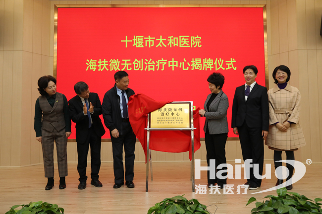 十堰市人民政府副市长刘运梅,十堰市妇联党组书记戴静,十堰市总工会党组副书记肖建军,解放军总医院(原北京301医院)宋磊教授,超声医疗国家工程研究中心主任、海扶刀®第一发明人王智彪教授、太和医院妇产中心主任张春莲为十堰市太和医院海扶®微无创治疗中心揭牌。
