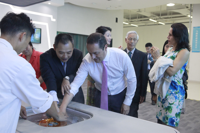 路易斯·蒙萨尔韦大使一行观摩了聚焦超声外科模拟治疗,并亲身感受了超声波穿透手掌将有机玻璃片“消融”,自己的手掌却毫发无损的“神奇”治疗,对HIFU技术赞叹不已。