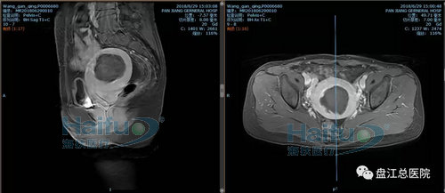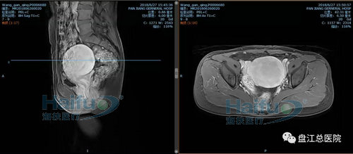 术前磁共振增强横断位及矢状位,见病灶内明显强化