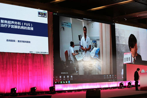 为展示聚焦超声手术治疗子宫腺肌病的情况,王智彪教授还现场连线重庆海扶医院,在邓勇斌医生的配合下,向在场3000多名妇产科医生展示不开刀治疗子宫腺肌病的过程。通过实时治疗监控画面,展示了不需无菌环境,没有出血,不同于传统开刀手术室的无创聚焦超声手术室。在治疗后即刻做超声造影时可以看到病灶内出现了非常明显的灰度变化,证明病变组织已经被消融坏死。