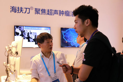 海扶医疗的展台吸引了大量观众驻足参观,同时也引来了不少媒体的关注。王智彪教授在与媒体记者的对话中说道:“这次活动的主题是科技创新,强国富民。海扶医疗就是这个主题很好的代表。我们的技术,我们的设备是中国人发明的,具有完全自主知识产权,并且我们中国在聚焦超声治疗这个领域领先全球!这是科技创新的结果。前段时间的贸易战,很可惜,我们就是没有自主的知识产权,很被动,但如果在聚焦超声治疗领域,我们不怕,我们一定会赢!因为知识产权都在我们这里。我们用自己的高科技让国家变得强大,变得更有实力。”