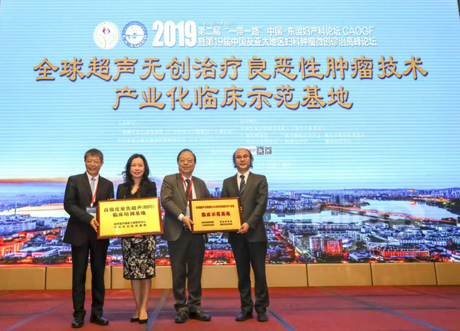 中国亚太地区微创妇科肿瘤协会Felix Wong主席、重庆医科大学王智彪教授为广西柳州市妇幼保健院成为全球超声无创治疗良恶性肿瘤技术产业化临床示范基地、高强度聚焦超声(HIFU)培训基地授牌。