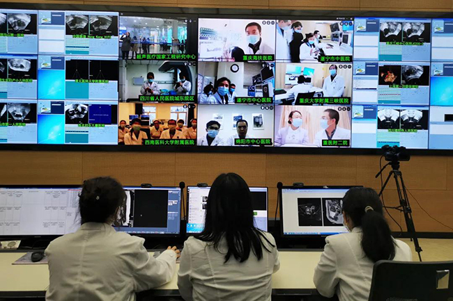 4月22日下午,在超声医疗国家工程研究中心的聚焦超声消融手术全球协同服务中心,绵阳市中心医院海扶®微无创治疗中心与川渝两地使用该技术的四川省人民医院城东院区、西南医科大学附属医院、遂宁市中心医院等8家医院,在线交流正在实时开展的聚焦超声消融手术情况。当天,重庆市卫生健康委党委书记、主任黄明会,陪同四川省卫生健康委主任何延政等一行,到超声医疗国家工程研究中心调研。