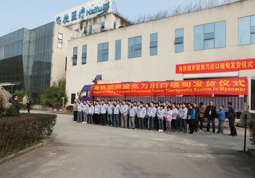 2015年1月13日,在冬日的暖阳中,海扶医疗进入缅甸的首台海扶刀®JC型聚焦超声肿瘤治疗系统“整装”待发。部分海扶人,在明媚的海扶园区内举行了一场隆重而简短的发货仪式,海扶医疗在缅甸的合作伙伴黄先生一行也出席了这个对他们来说意义非凡的仪式。