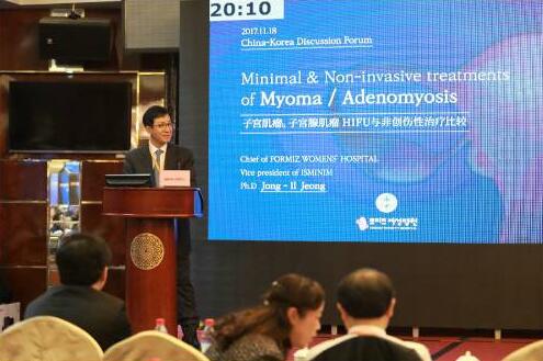 韩国FORMIZ女性医院郑锺逸院长介绍了韩国盆腔超声检查 出的子宫肌瘤及子宫腺肌病的诊断率(子宫肌瘤20%,子宫腺肌病12%,子宫肌瘤合并子宫腺肌病3.1%)。指出症状有无与患者的治疗相关,应根据其进行个性化治疗方法的规划。然后对最小侵入性治疗子宫肿瘤消融手术、非侵入性(非创伤性)治疗HIFU、增进HIFU效果的并行治疗进行了详细的阐释,让在场嘉宾对韩国HIFU的应用及开展情况有了更深入的了解。