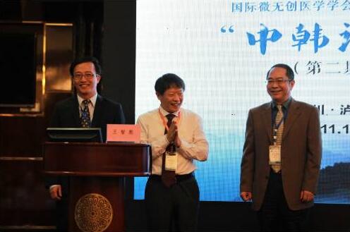 超声医疗国家工程研究中心王智彪主任致辞,中韩论道,论什么道呢?论微无创医学之道。在聚焦超声领域,我们刚开始,希望大家团结起来,为医学进步做一点贡献。虽然在医学领域,我们占的比重还很小,但大家一起努力,不会孤单。之后,王教授和陈文直教授、张炼教授一起向在场嘉宾表示感谢,希望通过这项技术,和大家越走越近。